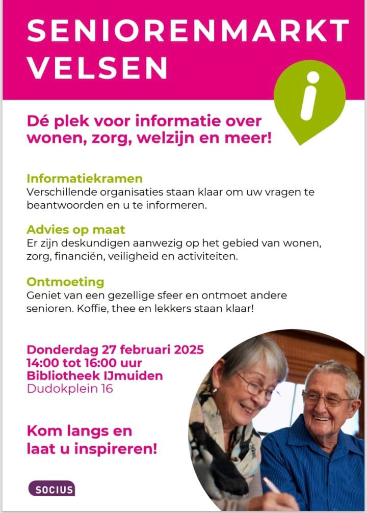 Op donderdag 27 februari is de Seniorenmarkt Velsen in Bibliotheek Velsen. U kunt hier terecht voor informatie over wonen, zorg, welzijn en meer! WonenPlus Velsen is ook aanwezig.